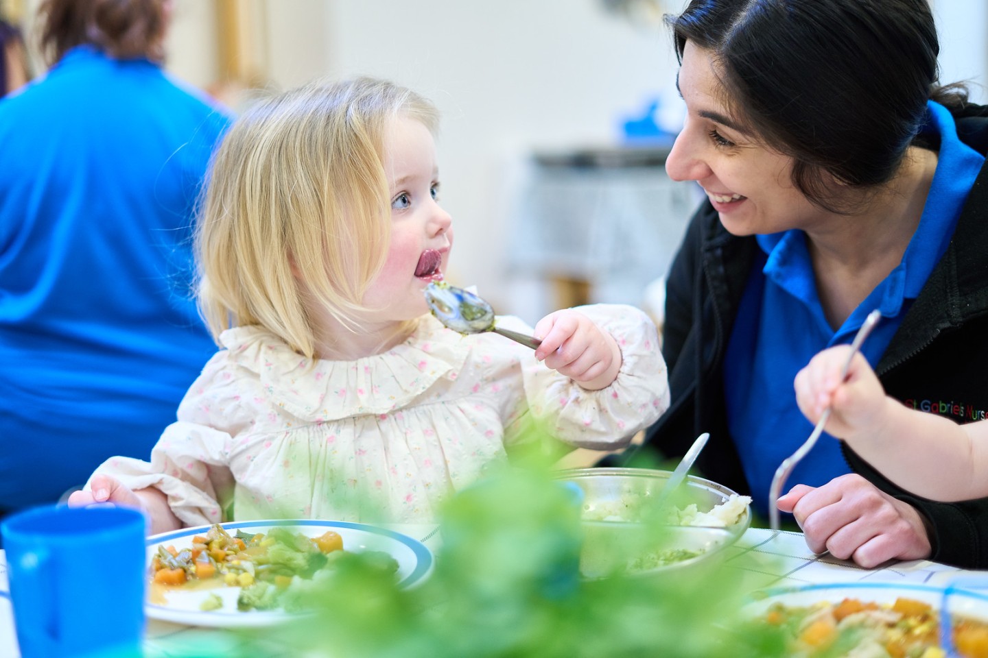 We believe mealtimes are valuable social occasions at St. Gabriel's Nursery, with staff dining alongside children and modeling positive table manners. Our preschool children are encouraged to develop essential life skills, such as self-serving meals, pouring drinks, and clearing their places, fostering independence and confidence.